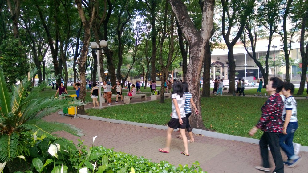 Saigon wakes up early: the streets are bustling by 6 am. A large downtown park sees many people out for morning walks and calisthenics. It gets so hot here that early morning is a comfortable time to be out and about.